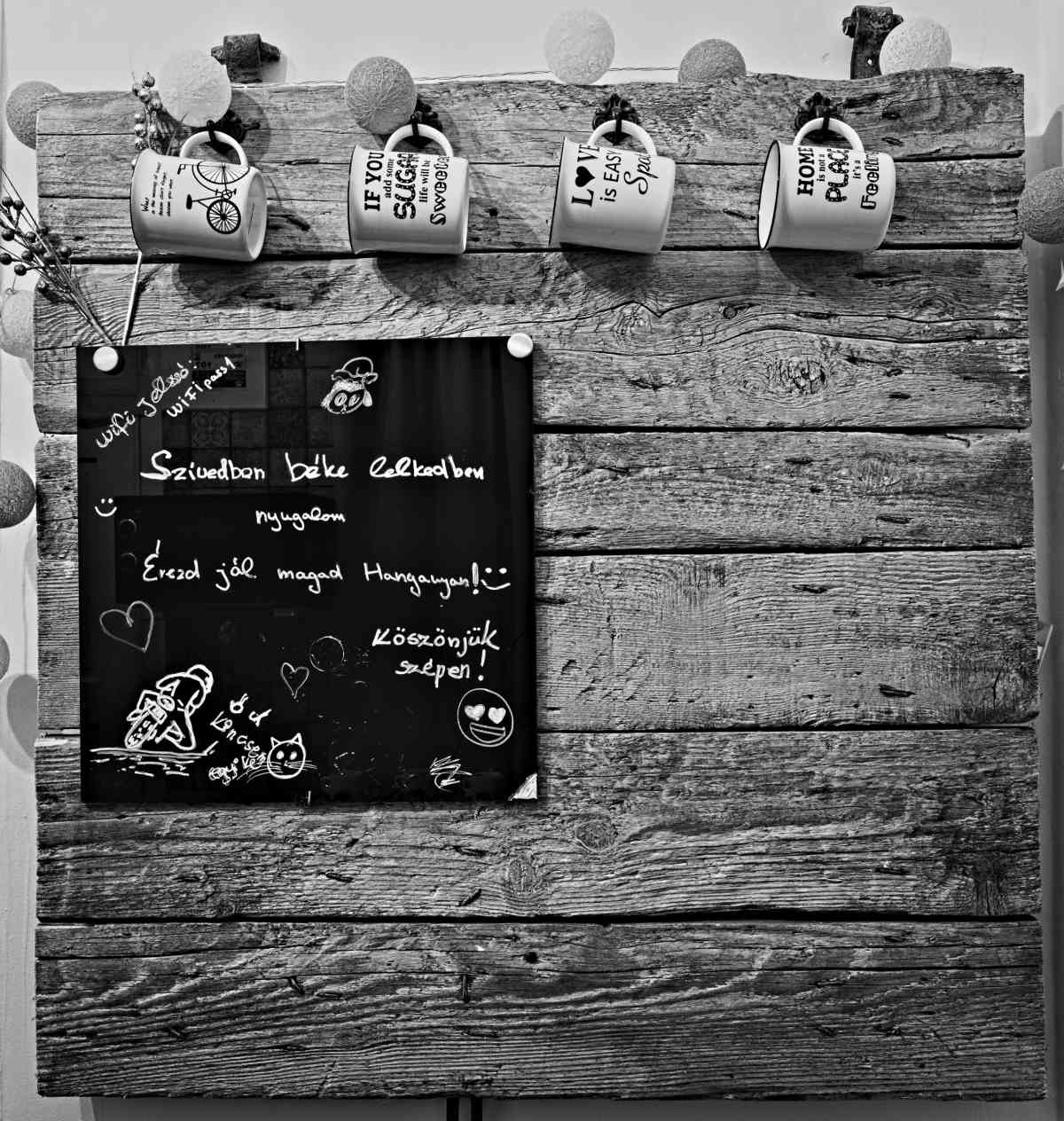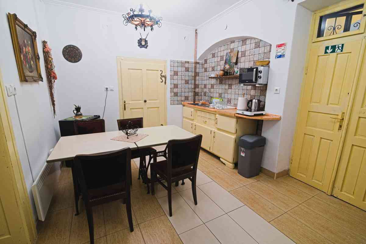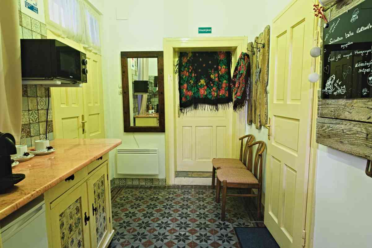 A főzőkonyha és étkező/közösségi helyiség a terasz másik ajtaján keresztül közelíthető meg (CSEREPES szoba).