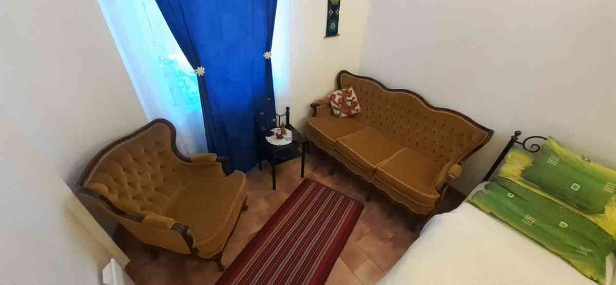 A második ajtó a lakrészbe vezet. Ahol: 2 fotel, szekrény, éjjeliszekrény, asztal és 2 ágy található.