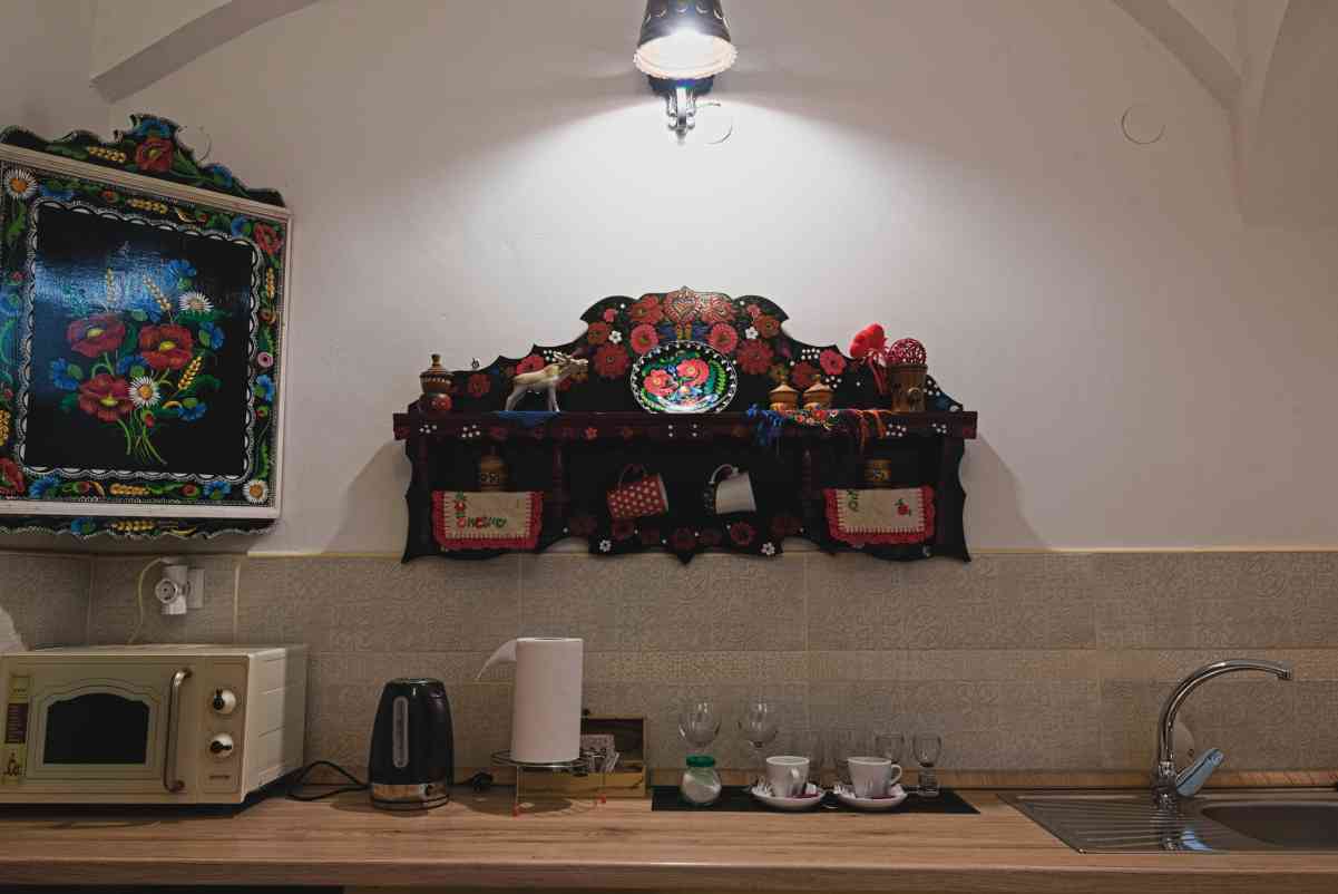 hűtő, mikrohullámú sütő, vízforraló, tányérok, edények, poharak és evőeszközök, papírtörlő.